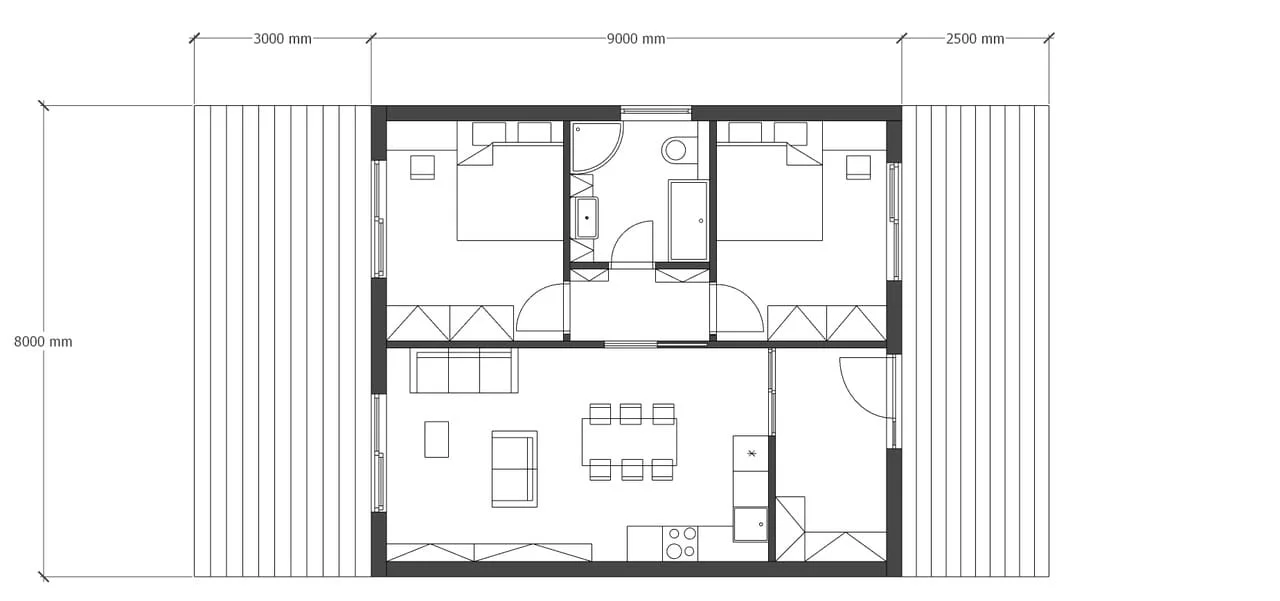 A MODUL II két azonos méretű modulból áll, mindegyik maximális mérete 9 × 4 m. Ez az elrendezés lehetővé teszi tágasabb helyiségek kialakítását, amelyek ideálisak kisebb családok számára.