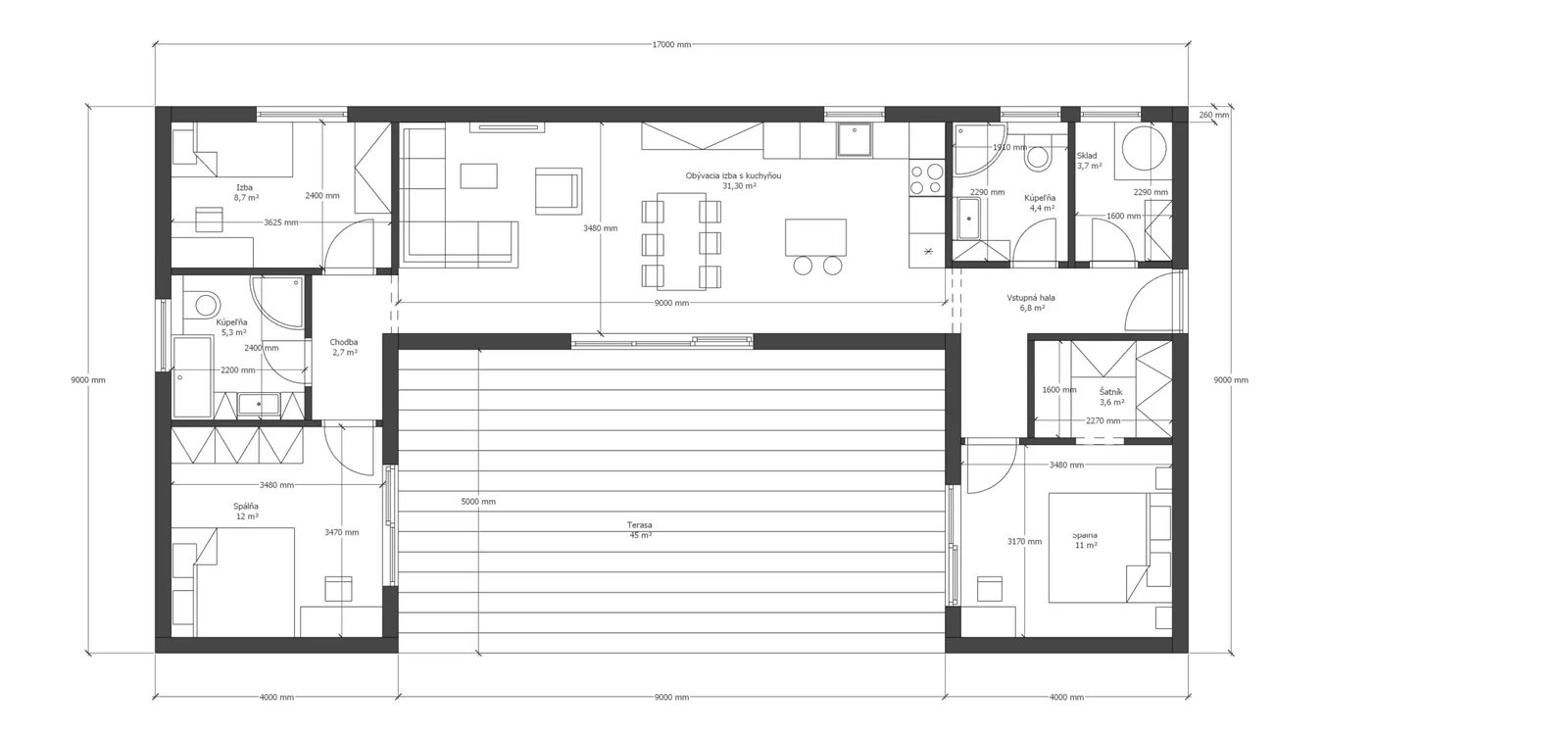 Az U alakú házak ideálisak nagyobb családok számára, mivel lehetővé teszik az egyes lakóterek kényelmes elkülönítését – például nappali, hálószobák vagy vendéghelyiségek.