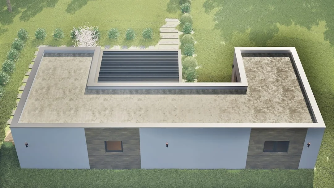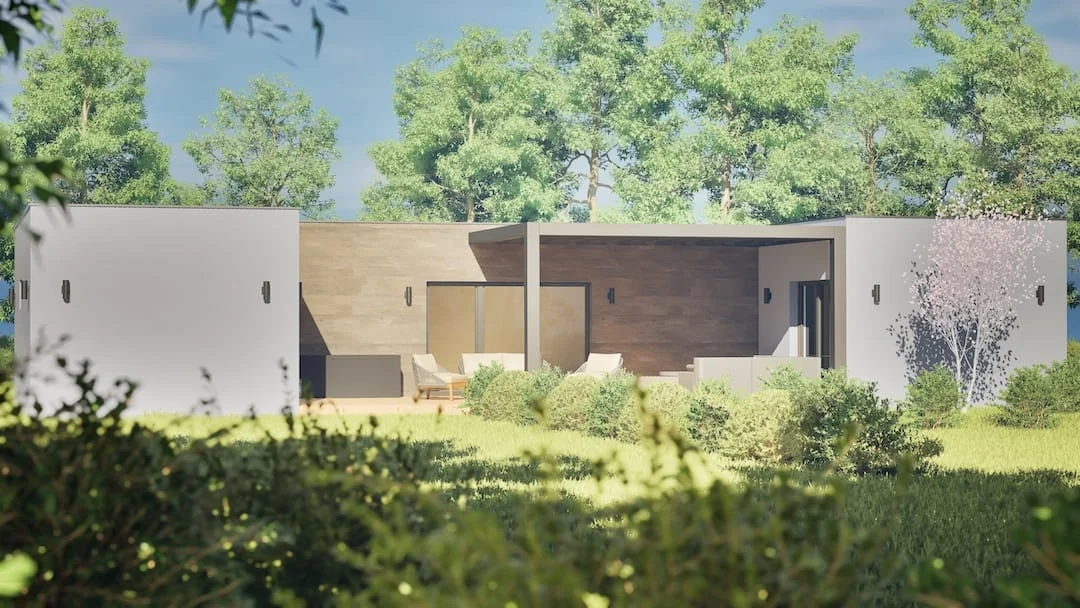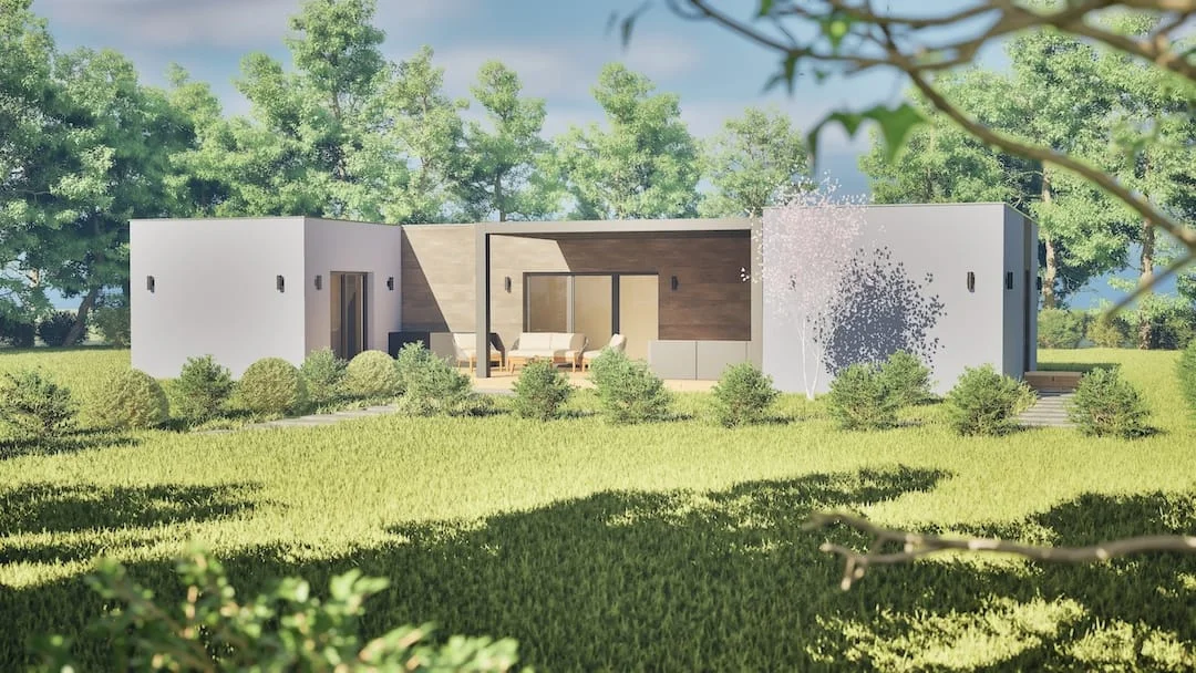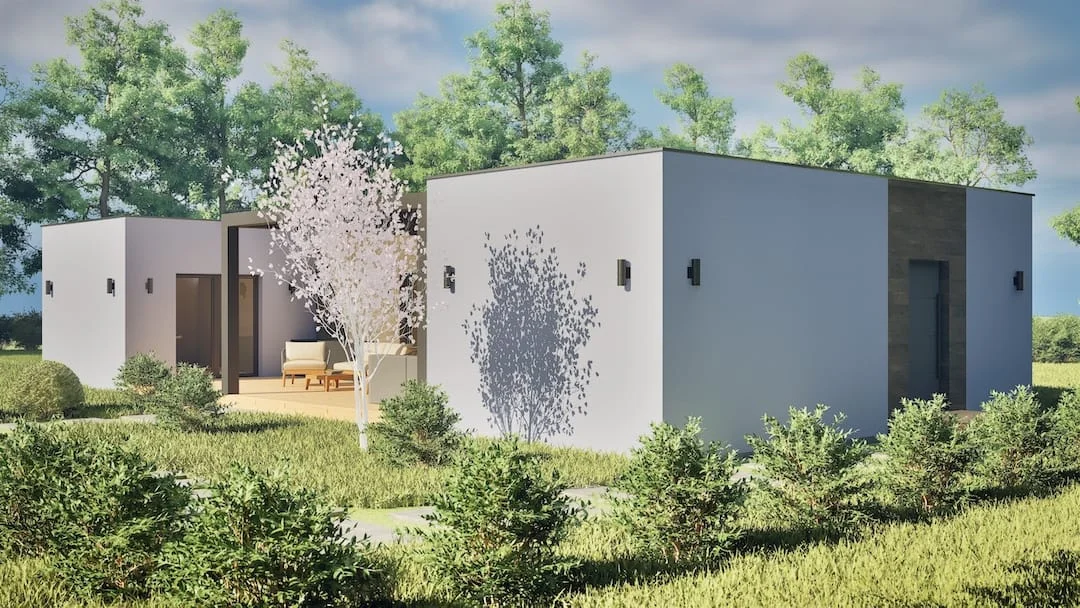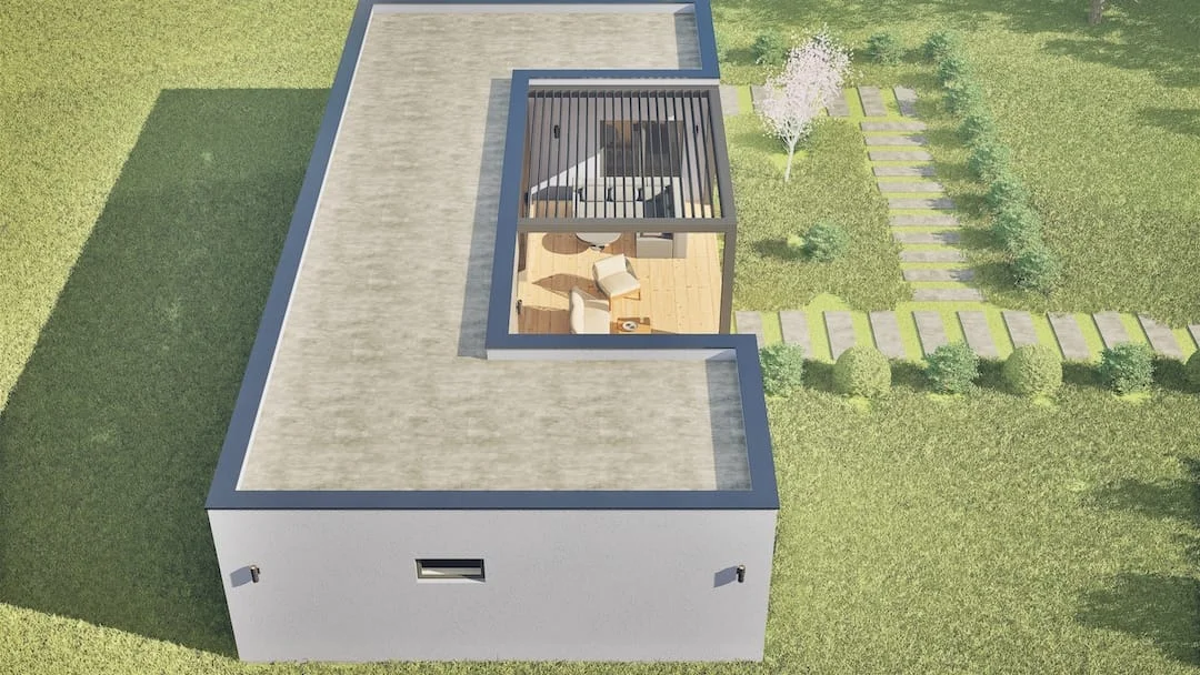 Az U alakú modulházak egyedi elrendezést kínálnak, ahol a központi részt egy udvar vagy terasz alkotja, amelyet az épület három oldala vesz körül.